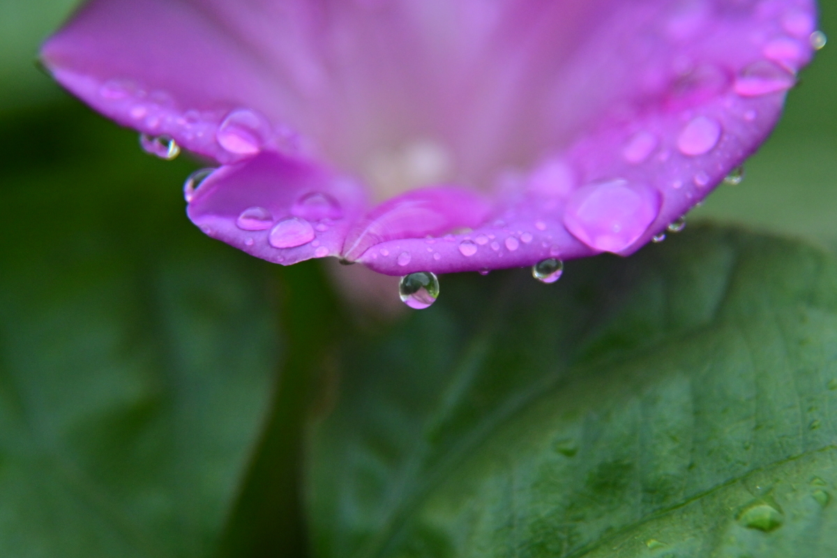 花弁の下の水滴がほぼ球体になってます。もう少し大きければ水滴内にピントを合わせて遊べました。