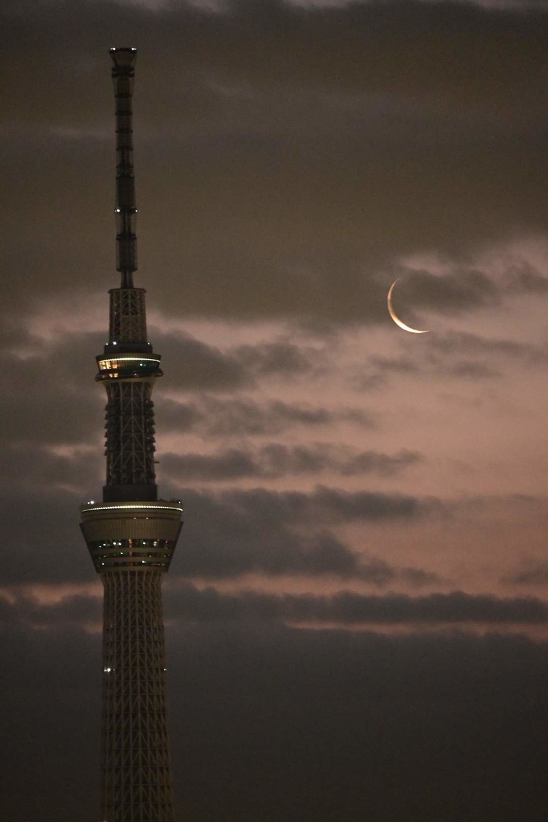 一発芸です。今朝の朝焼けのスカイツリーと月です。D750+24-120 F4通しでの撮影です。