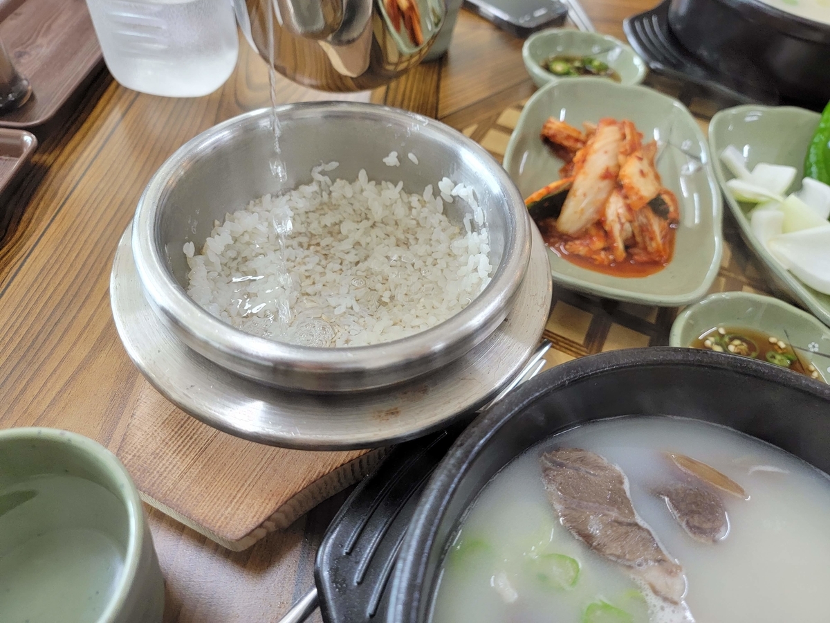 ライスをコムタン(牛スープ)の中に入れてお焦げにお湯を入れて最後の口直しにします。