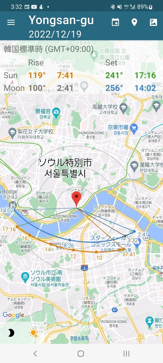 ↑androidアプリ『Sun Position』で日の出の位置を確認して撮影スポットをテキトーに決めました。あとは現地で調整します。