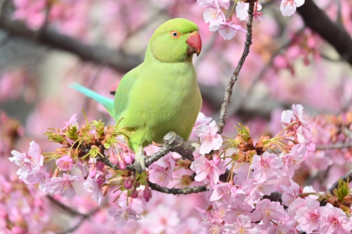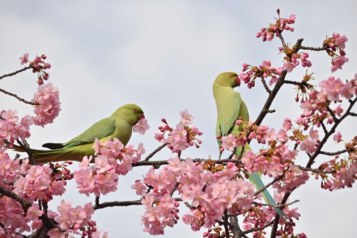 チャリンコで疾走していると・・早咲きの桜に『ワカケホンセイインコ』を見かけました・・