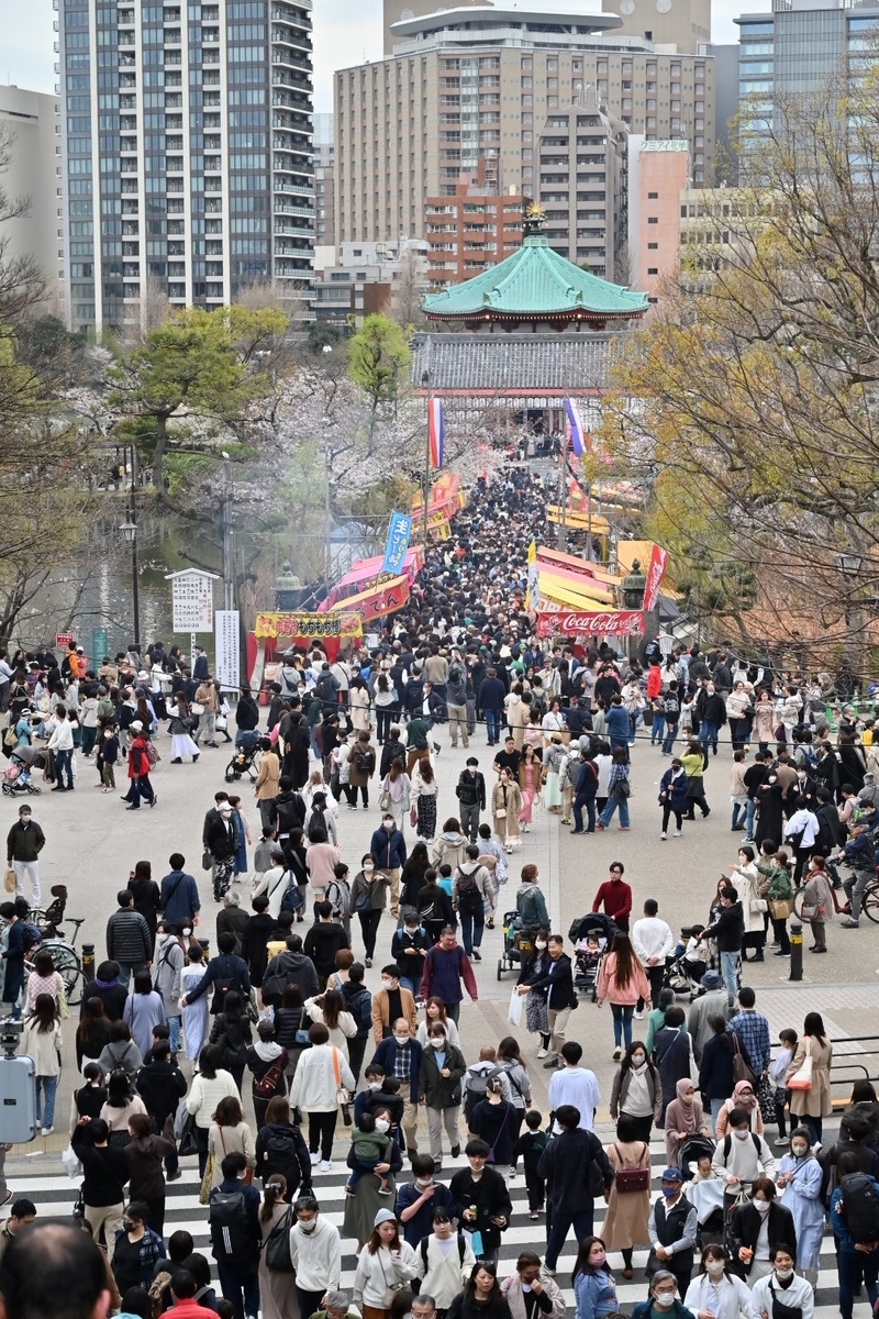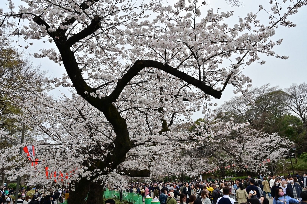 桜並木から不忍池辯天堂を撮影、ものすごい人です❗
