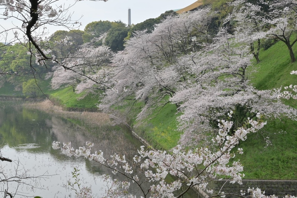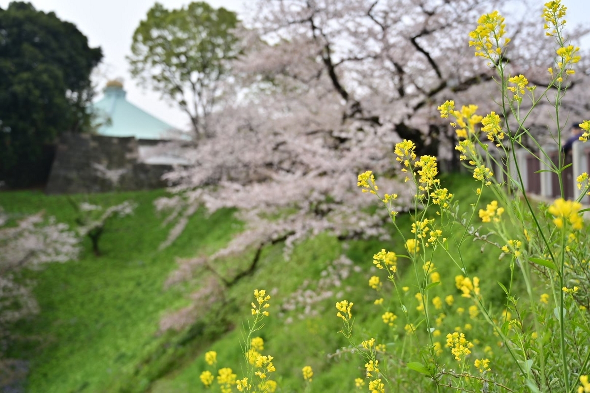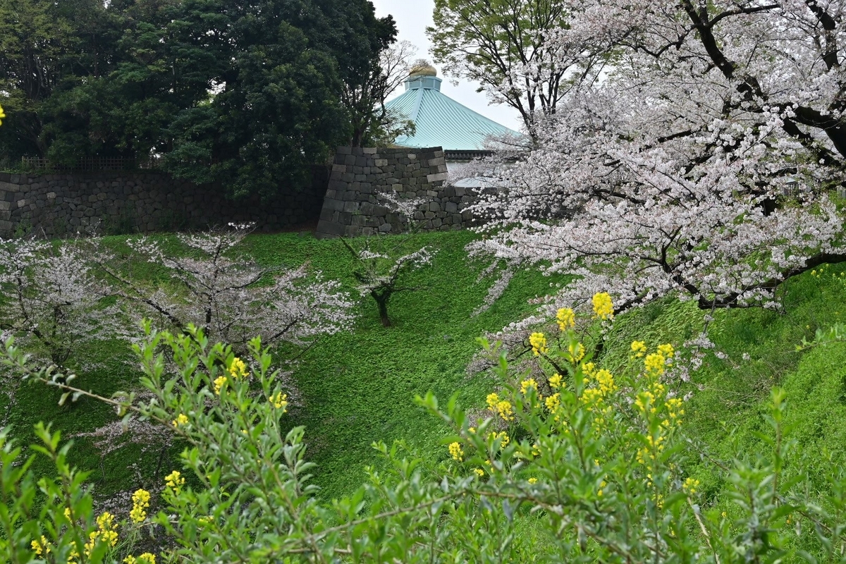 皇居のお堀の周辺は九段坂以外でも菜の花と桜を合わせられるスポットがちらほらあります。