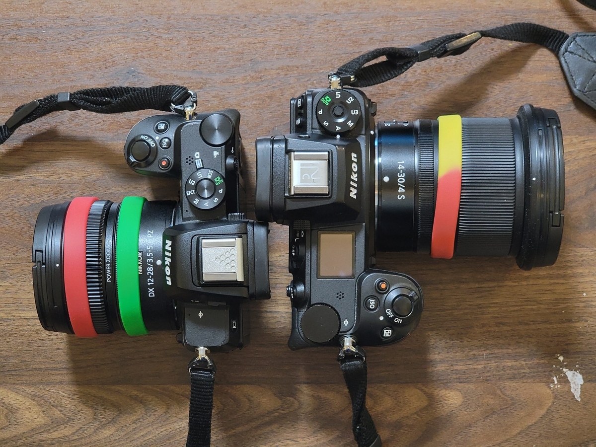 では『Z 50+NIKKOR Z DX 12-28mm f/3.5-5.6 PZ』手持ちの別カメラ『Z6Ⅱ+NIKKOR Z 14-30mm f/4 S』と大きさを比べます。