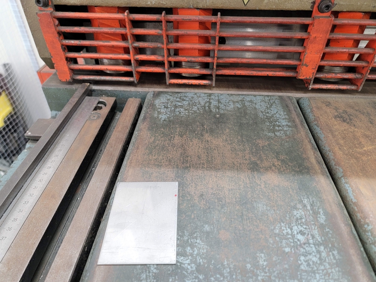 シャーリング(鉄板切り機)で適当な板を切り出します。