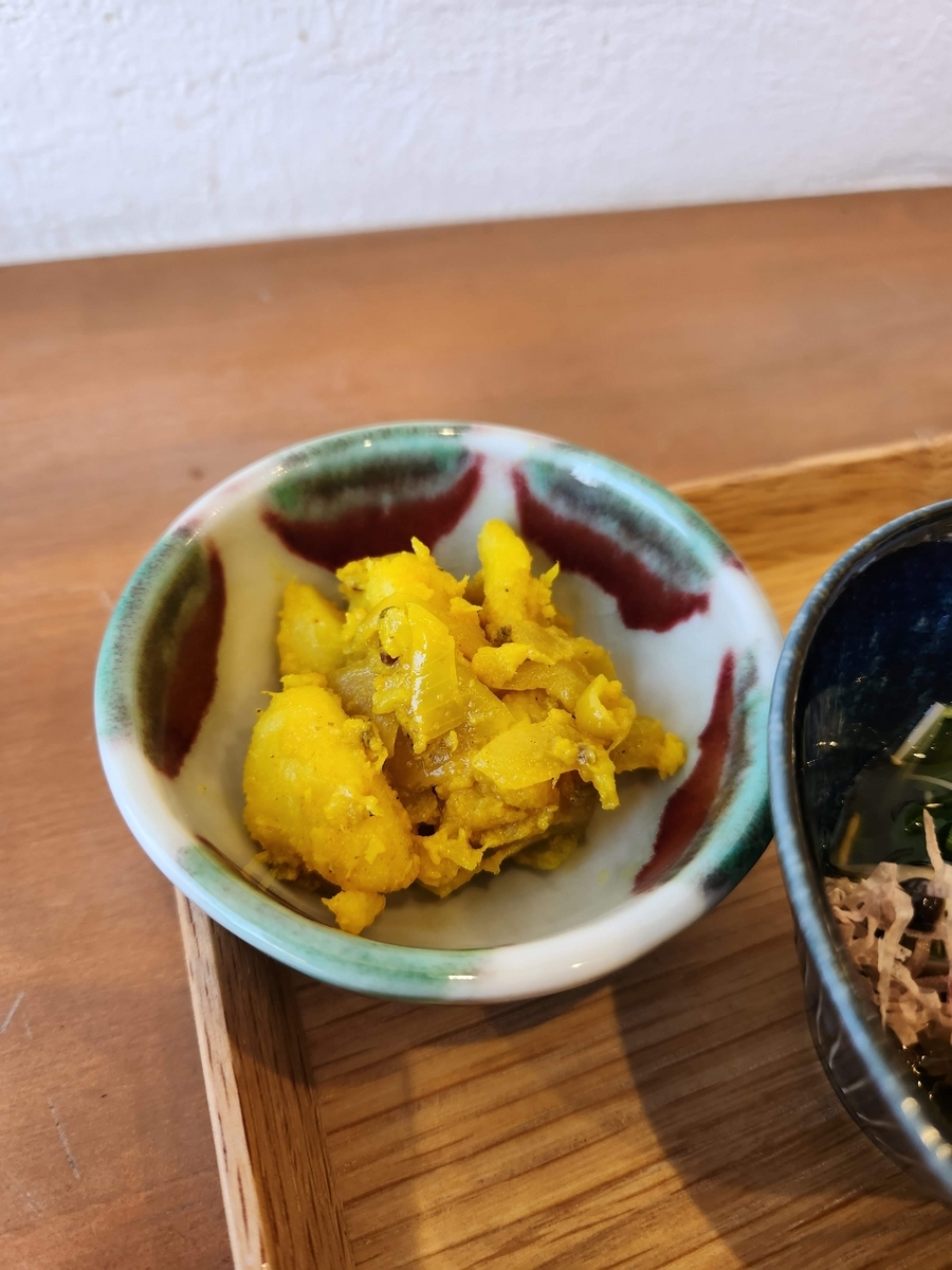 ↑カレー的な調味料が入ったエスニックな小鉢です。