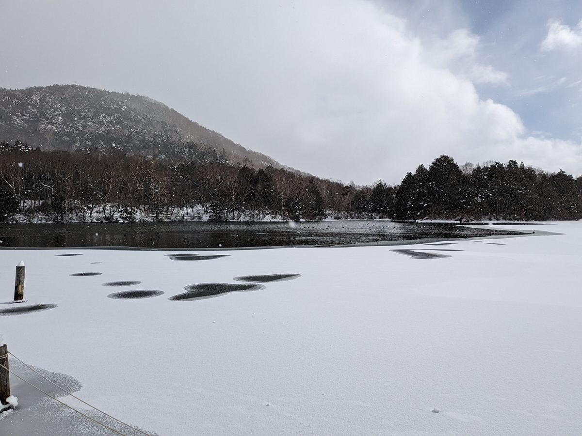 湯ノ湖に到着しました・・この時期に全面凍結してないとは😅