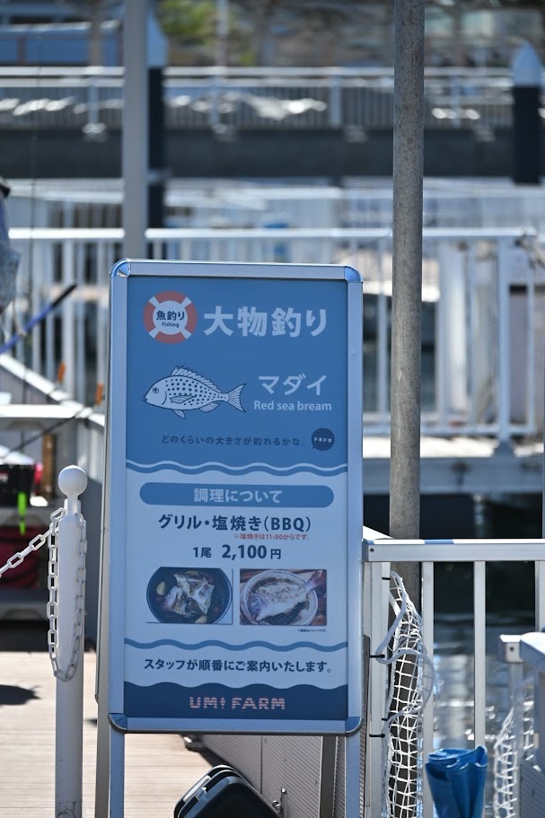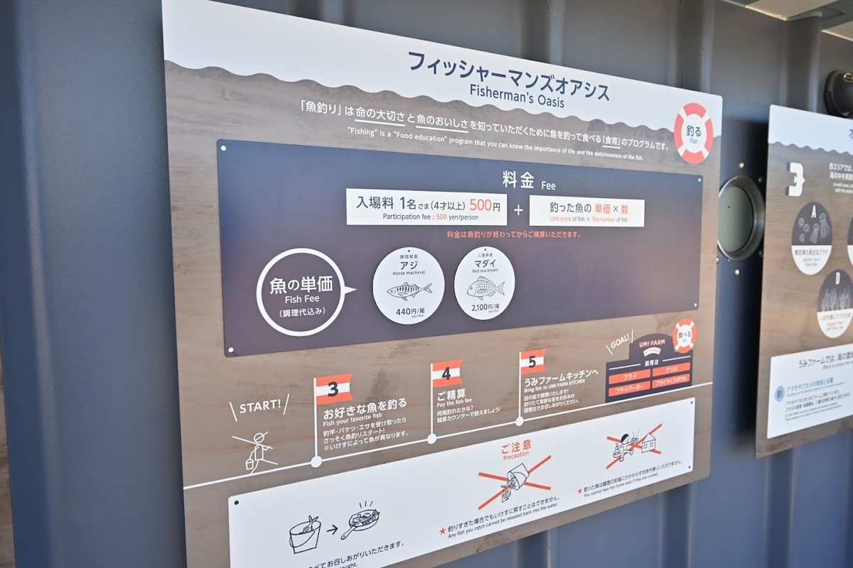 入場料一人500円、釣った魚の種類と数で料金が変わり『アジ:440円、マダイ:2100円』となっております。
