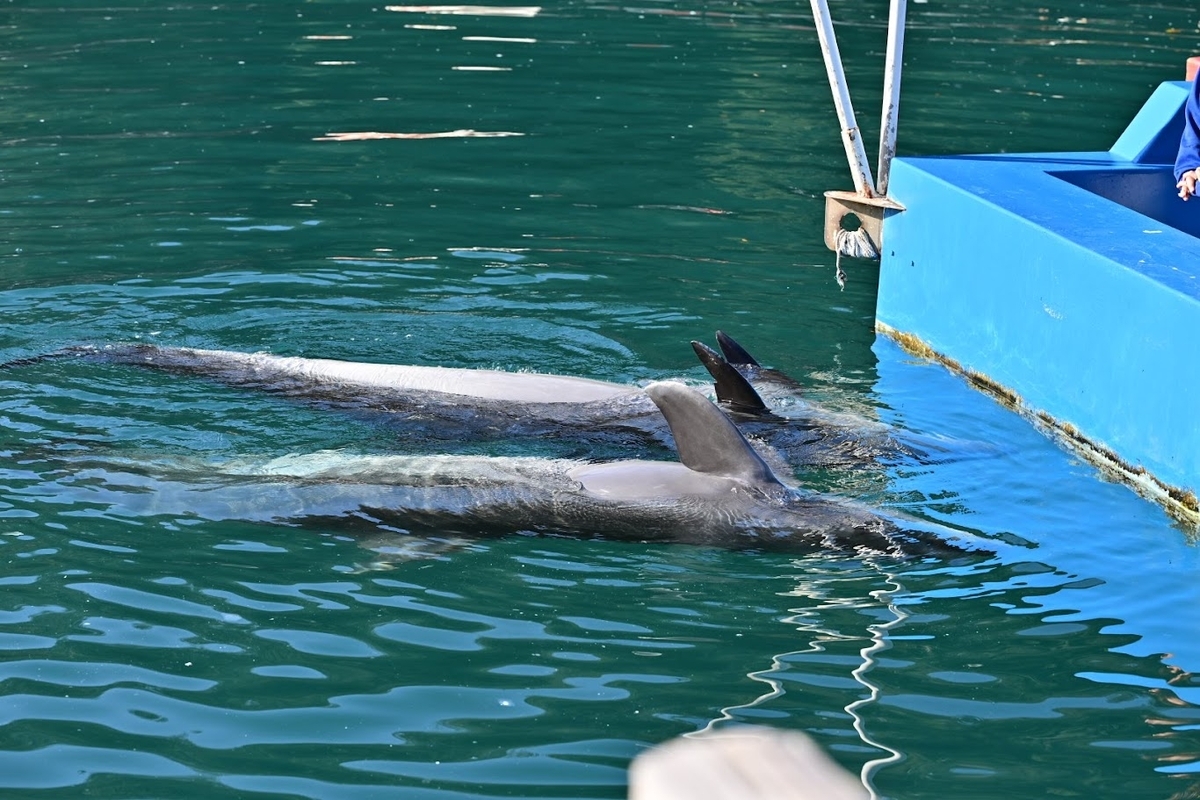 入江の中を自由にイルカが泳いでました😊