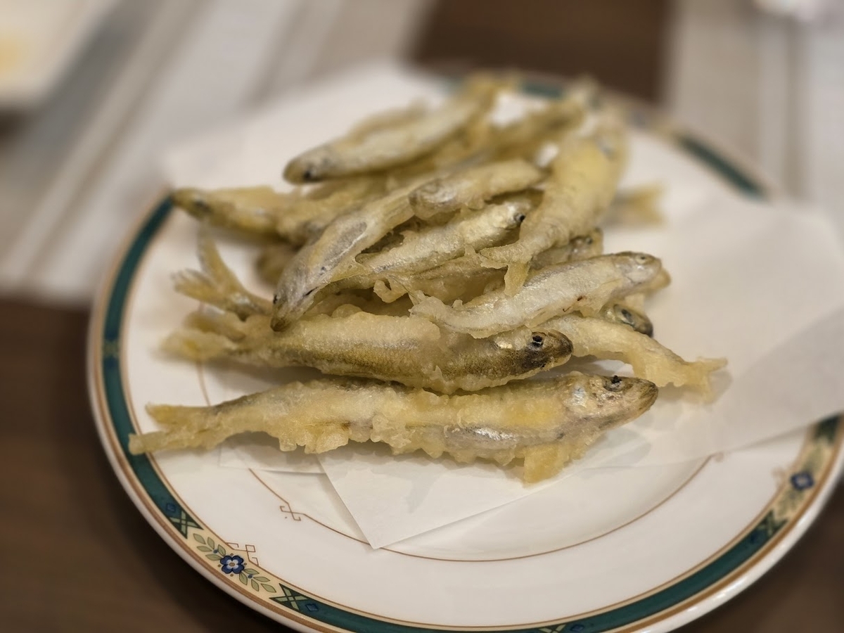 名人の宿で釣れたてのワカサギの天ぷらにしてもらったぞ❗️