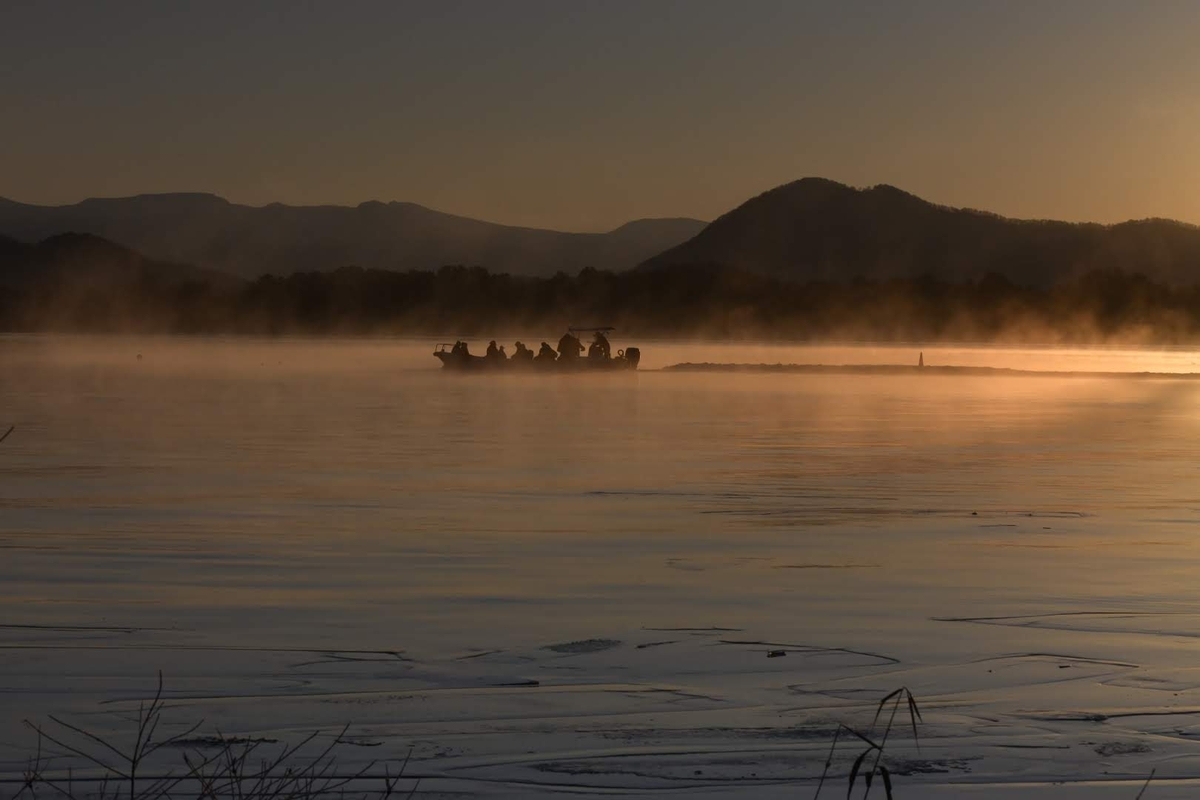ワカサギ釣りの方でしょうか?遠くで船に乗る集団がいました