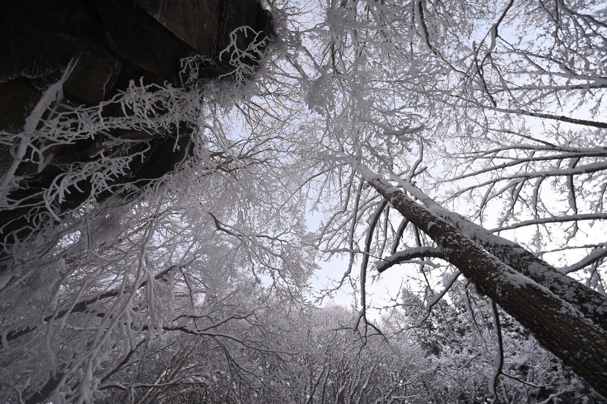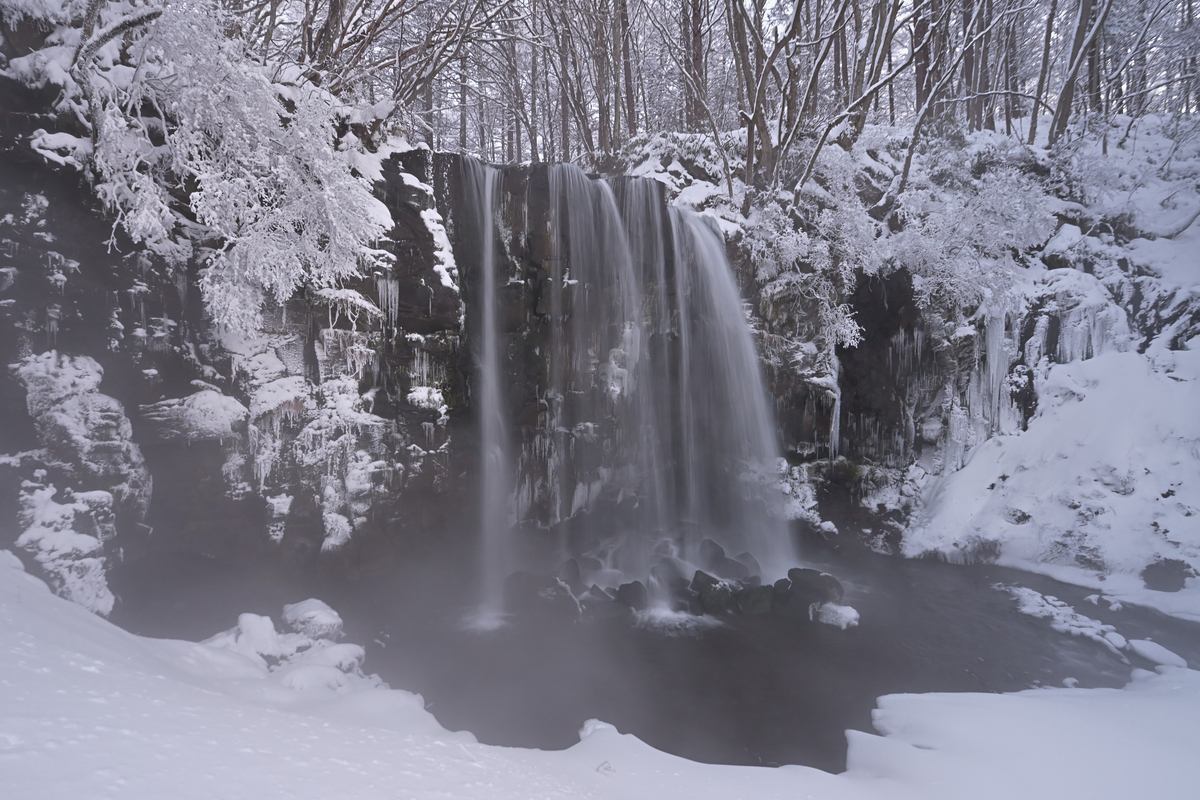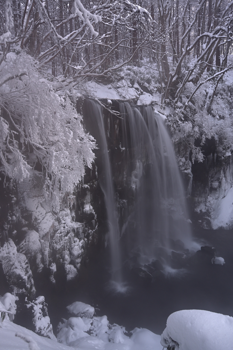 唐沢の滝は水温が高め(と言っても湧き水だと思います)でどんなに寒くても凍ることがありません。気温が低いと飛沫が周囲の木に張り付いて美しい氷結状態になります❗️